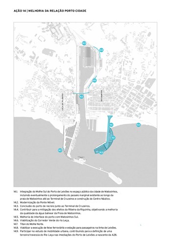 14.1. Integração do Molhe Sul do Porto de Leixões no espaço público da cidade de Matosinhos, incluindo eventualmente o prolongamento do passeio marginal existente ao longo da praia de Matosinhos até ao Terminal de Cruzeiros e construção de um Centro Náutico14.2. Modernização da ponte móvel